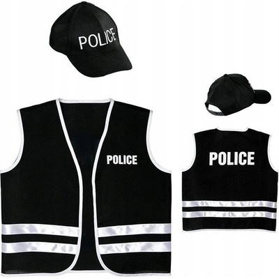 KOSTÝM POLICISTY 140 Sada obsahuje: - vesta, - čepice. Sada policisty. Produkt v černé barvě je zdoben nápisem „Police“. Určeno pro dítě. Ideální doplněk k karnevalovému...
