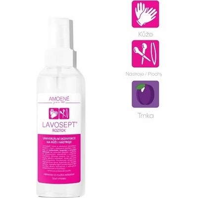 Amoene Lavosept roztok univerzální dezinfekce kůže i nástrojů 500 ml rozprašovač aroma citron. Baktericidní, fungicidní a virucidní účinnost. Eliminuje bakterie, viry, vláknité...
