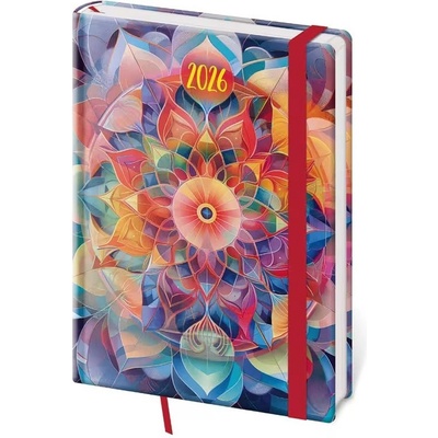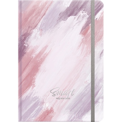 Velký plánovací diář na rok 2026. Na levé straně jsou dny v týdnu a na pravé linkovaná stránka na poznámky. Diář má pevnou vazbu v kartonových deskách. Obepíná ho pružná páska...