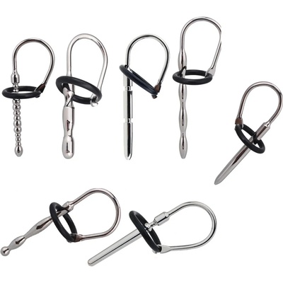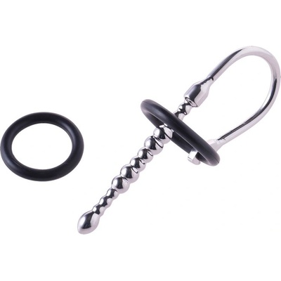 Dlouhý ocelový penis plug s vyměnitelnými silikonovými kroužky okolo žaludu. Celková délka 113 mm, použitelná délka 90 mm, průměr 6 – 8 mm. Vnitřní průměry kroužků 25 a 30 mm.
