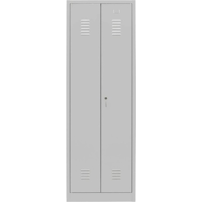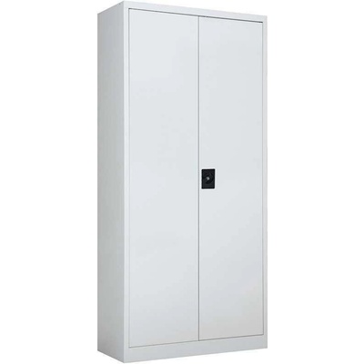 Dvoudveřová kovová skříň na soklu. Výška 1950 x šířka 800 x hloubka 400 mm, barva světle šedá RAL 7035, rozvorový cylindrický zámek, 4 police.