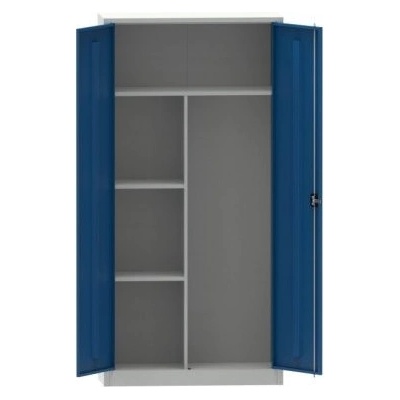 Úklidová skříň s ocelovou konstrukcí. Na levé straně - 4x police, na pravé straně tyč s posuvnými háčky a 1x police. Cylindrický zámek. Barva korpusu a dveří šedá RAL 7035....