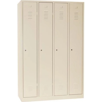 Šatní skříň Manutan Luna, 4 oddíly, cylindrický zámek Ocelová šatní skříň se čtyřmi samostatně uzamykatelnými boxy. Dveře skříňky jsou perforované pro cir ... Ocelová šatní...
