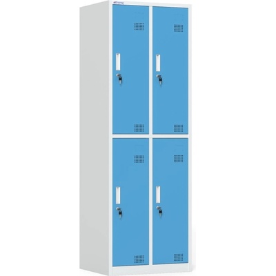 Šatní demontovaná skříňka, výška 1800 x šířka 600 x hloubka 500 mm. Uzamykání cylindrickým zámkem se dvěma klíči. Povrchová úprava práškovou barvou šedá RAL 7047/ modrá RAL 5015.