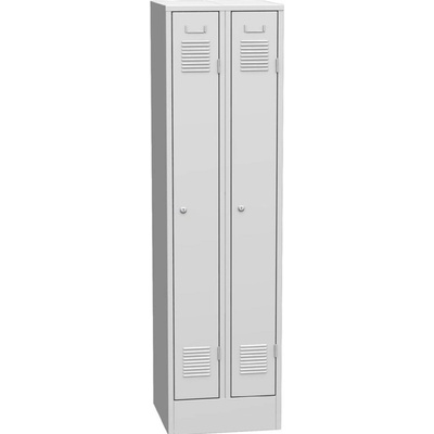 Dvoudílná šatní skříň na soklu, rozm.: 1850x600x500mm. Uzávěr na visací zámek (visací zámek není součástí dodávky). (Dříve označení K2438 O1) Plechové šatní skříně tohoto typu...