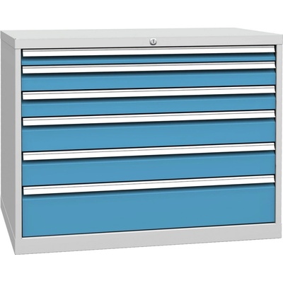Pětizásuvkový kontejner pracovního stolu, šířka 1000, výška 810, hloubka 700 mm. 1x zásuvka 60, 2x 90, 2x 120, 1x 180 mm. Barva korpusu RAL 7035 světle šedá.