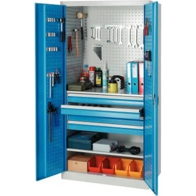 Dílenská univerzální skříň Mevatec s dveřmi - 4 zásuvky Robustní ocelová konstrukce s nosností až 800 kg Police přestavitelné po 25 mm, zásuvky s výsuvem 80 % Vybaveny...