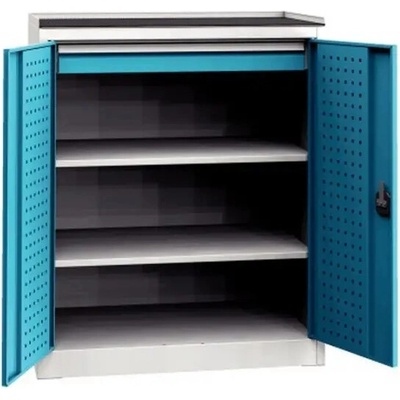Univerzální dílenská skříň Mevatec s dveřmi - 2 police, 1 zásuvka Výška skříně 1180 mm umožňuje využít horní část jako odkládací nebo pracovní plochu Odkládací plocha je...