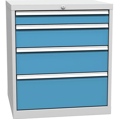 Čtyřzásuvkový kontejner pracovního stolu, šířka 720, výška 810, hloubka 700 mm. 1x zásuvka 90, 1x 150, 1x 180, 1x 240 mm. Barva korpusu RAL 7035 světle šedá.