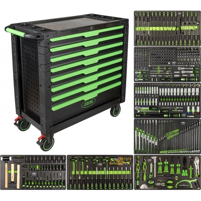 Montážní dílenský vozík na nářadí JBM 54688, XL. Moduly s kvalitním ručním nářadím, 8 zásuvek různé výšky, zcela otevíratelné na teleskopických pojezdech. Zásuvka výšky 75 mm je...