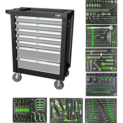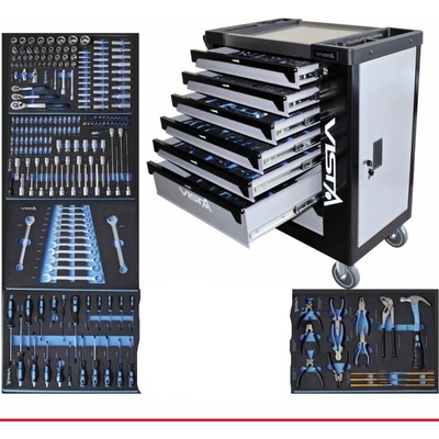 Profesionální dílenský vozík vybavený celkem 246 ks nejpoužívanějšího nářadí. Samotný vozík obsahuje 7 uzamykatelných zásuvek vybavených nářadím v pěnových výplních. Zásuvky...