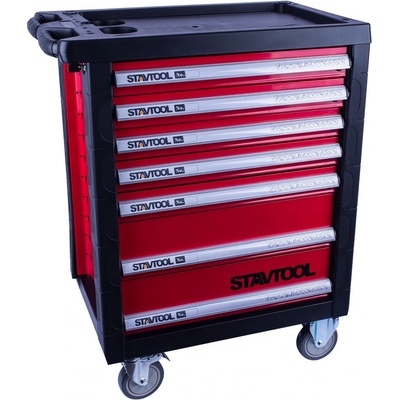 Nářadím vybavený dílenský montážní vozík STAVTOOL PWT220BKvalitní vybavený plechový montážní dílenský vozík na nářadí s plastovými doplňky a se 7 zásuvkami. Dvě pevná a dvě...