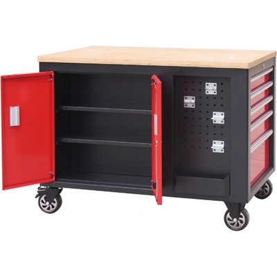 Velký dílenský vozík využitelný ze všech stran. 10 zásuvek. 2x děrovaní desky s přihrádkou. Madlo a kolečka pro snadnou manipulaci. Černo-červený velký dílenský vozík s 10-ti...