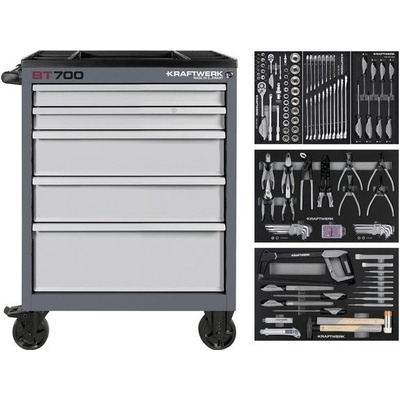 - Dílenský vozík KRAFTWERK se 154 kusy vysoce kvalitního nářadí umístěného ve 3 skvěle padnoucích vložkách z měkké pěny s vysokou hustotou (EVA) 60 x 40 cm - Horní kryt je...