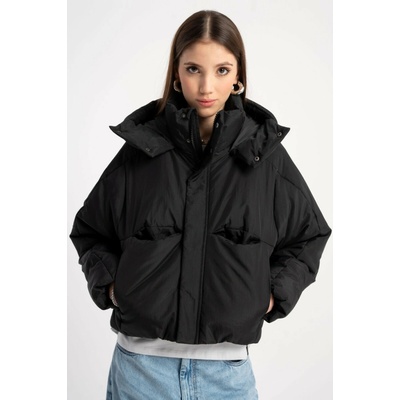 Černá zimní bunda s kapucí a kožešinovým límcem, na zip - volný střih, - dlouhý rukáv, - rukáv a spodek zakončeny gumou všitou uvnitř, - zapínání na zip a patentky, - prostorná...