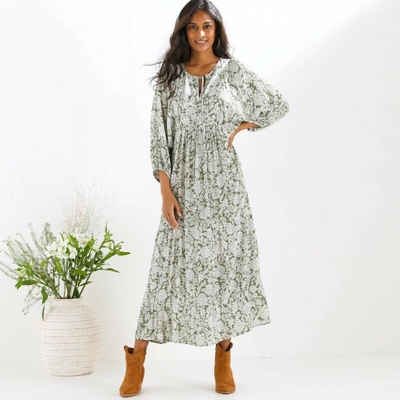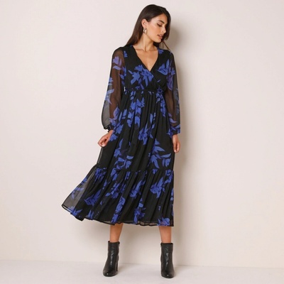 Dlouhé volánové šaty s potiskem se hodí pro běžné nošení i slavnostní příležitosti. Dlouhé, mírně nadýchané rukávy zakončené manžetou na knoflík. V ramenou nařasení. Výstřih do...