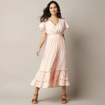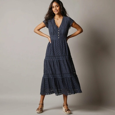 Módní dlouhé šaty s delikátní krajkou, macramé a jemným transparentním efektem! Vpředu výstřih do V na knoflíky. Krátké macramé rukávy. V pase přestřižení a nařasení. Volány s...