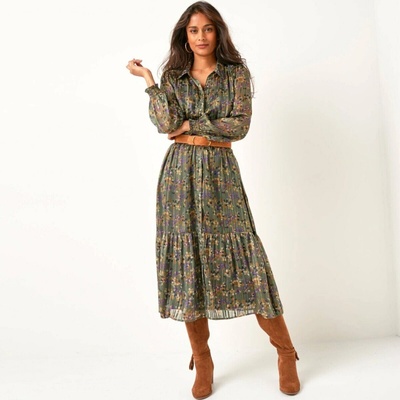 Dlouhé šaty s žakárovým květinovým vzorem představují neodolatelný ženský kousek. Košilový límeček, vpředu na knoflíčky. Dlouhé pružné rukávy s volánovým zakončením. Pásek...