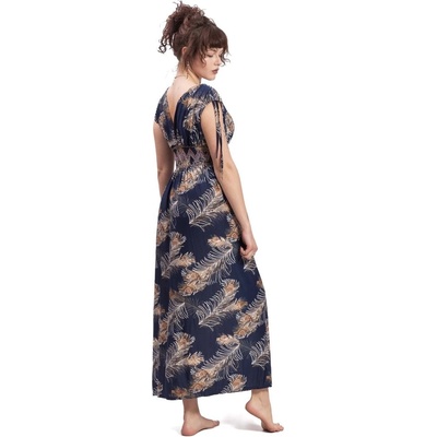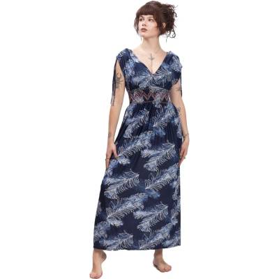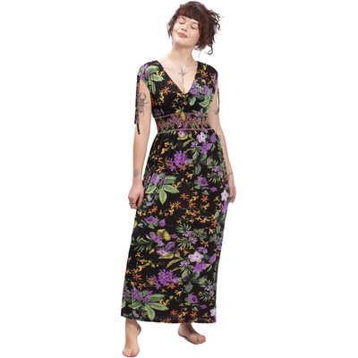 Dlouhé dámské šaty se vzorem květin a peří. Mají užší střih na hrudi a elastický pas. Od pasu dolů jsou šaty zcela volné. Rukávy jsou průhledné. Modelka měří 168 cm a má na sobě...