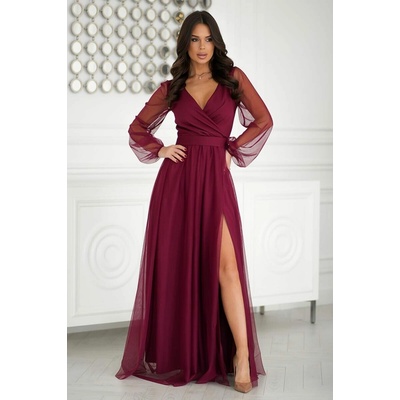 Elegantní dlouhé společenské šaty jednobarevné hluboký překládaný výstřih do V hluboký výstřih do V na zádech dlouhé, balonové, tylové rukávy do gumičky pevný pas - možno...