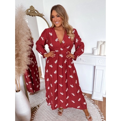 Elegantní dámské dlouhé šaty v cihlové barvě zdobené jemnými vyšívanými květinami. Šaty mají dlouhé rukávy, výstřih do V a gumičku v pase, která krásně zvýrazní postavu. Modelka...