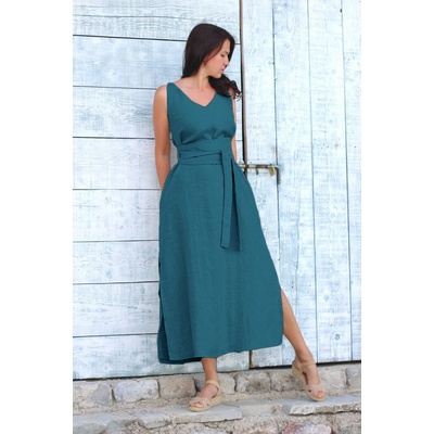 Maxi šaty Lotika ušité ze 100% lnu s láskou a péčí v českém Podkrkonoší jednobarevné výstřih do V širší ramínka boční všité kapsy vysoké boční rozparky áčkový střih příjemný...
