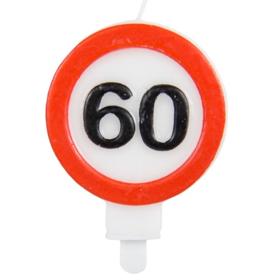 Narozeninová svíčka červeno-bílá s černým číslem 60 ve stylu dopravní značky, velikost 6 x 8 x 1,3 cm.