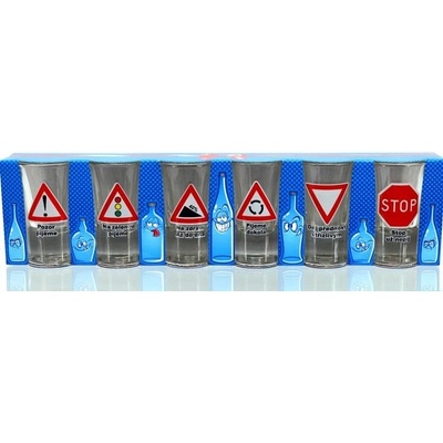 Panáky s motivy dopravních značek. Nápisy: pozor pijeme, na zelenou pijeme, na zdraví až do dna, pijeme dokola, dej přednost střízlivým, stop už nepij. S těmito panáčky si...