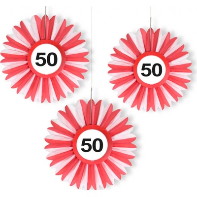 Závěsné dekorace papírové mini rozety v červeno-bílé barvě s černým číslem 50 ve stylu dopravní značky, výška 21,5 cm, velikost rozety 12,5 cm, v balení 3 ks.