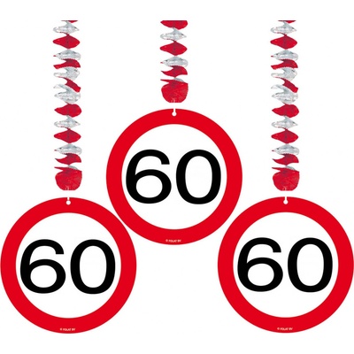 Narozeninové závěsné spirály červeno-bílé s číslem 60 ve stylu dopravní značky, materiál papír, velikost značky 17,5 x 17,5 cm, balení obsahuje 3 ks.