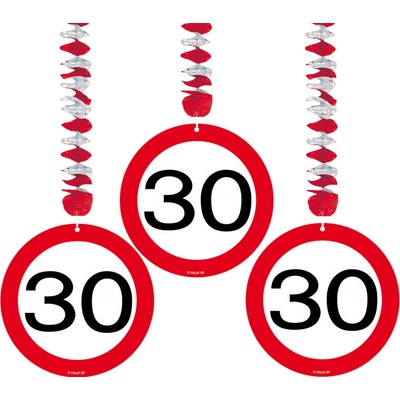 Narozeninové závěsné spirály červeno-bílé s číslem 30 ve stylu dopravní značky, materiál papír, velikost značky 17,5 x 17,5 cm, balení obsahuje 3 ks.