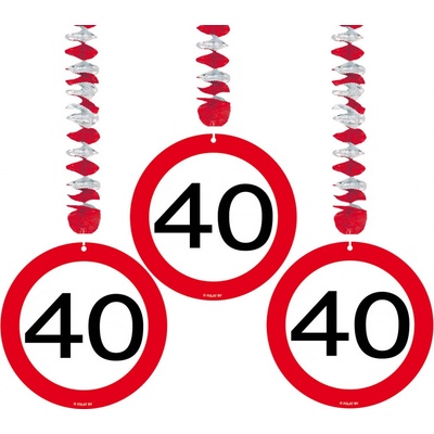 Narozeninové závěsné spirály červeno-bílé s číslem 40 ve stylu dopravní značky, materiál papír, velikost značky 17,5 x 17,5 cm, balení obsahuje 3 ks.