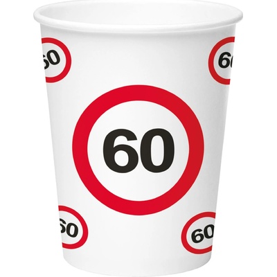 Papírové kelímky červeno-bílé s černým číslem 60 ve stylu dopravních značek, objem 250 ml, v balení 8 ks. Určeno pro studené nápoje.