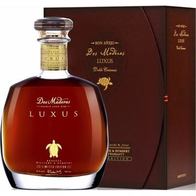 Dos Maderas Luxus, Ron Anejo Doble Crianza, Limited Edition v dárkové kazetě. Špičkový karibský rum Dos Maderas LUXUS, který již snese srovnání s vrcholnými řadami koňaků nebo whisky. Své vynikající chuti dosahuje díky 10 letému zrání v sudech v karibské oblasti.