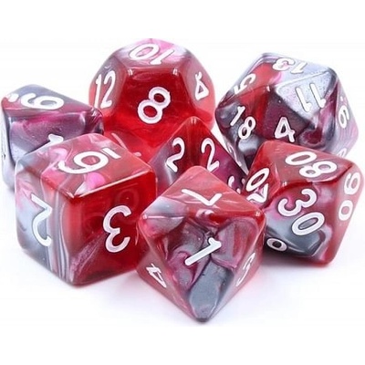 Sada sedmi různostranných kostek v barvě čerstvě prolité dračí krve. Krásná sada pro hraní her na hrdiny, obsahuje kostky k4, k6, k8, k10, k12, k20 a k%.