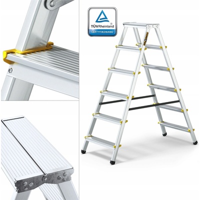 Schůdky hliníkové oboustranné DR(150)ALDD-6, počet nášlapů 2x6, výška 1,24 m, šířka 480 mm. Nosnost 150 kg.
