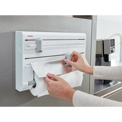 praktický zásobník na balící folie, papírové utěrky, alobal či sáčky na potraviny, vyrobený z vysoce kvalitního plastu v originálním designu, snadné a rychlé oddělení požadované délky, včetně kuchyňských utěrek, záruka 3 roky