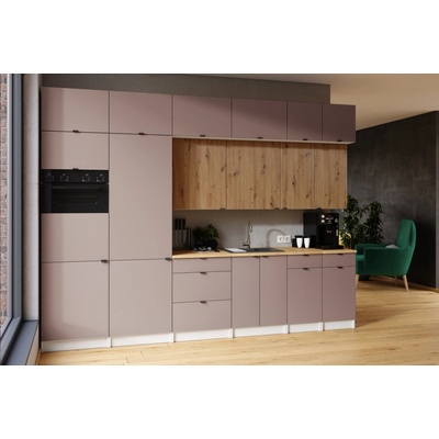 ROZMĚRY: Šířka spodních skříněk: 320 cm Šířka horních skříněk: 320 cm Výška spodních skříněk: 86 cm (2,8 cm pracovní deska/10 cm sokl) Výška horních skříněk: 72 cm Výška...
