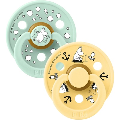 BIBS x Moomin Colour dudlíky 2ks (vel. 2) z přírodního kaučuku jsou měkké, pružné a bezpečné. Kruhový kroužek s otvory nedráždí pokožku, podporují přirozený vývoj dásní a zoubků.