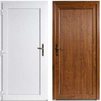 Plastové vedlejší vchodové dveře jednokřídlé o rozměru rámu 98x208 cm v bílé barvě z interiéru a v dekoru zlatého dubu z exteriéru. Dveře jsou ve verzi s pravým otevíráním a...