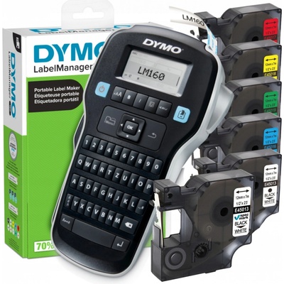 Ruční tiskárna štítků DYMO LabelManager 160 v sadě 5 pásek pro DYMO D1 ✅ Sada obsahuje: - Tiskárna štítků DYMO LabelManager LM160 (S0946320, S0946340) - Návod k rychlému startu - Páska 45013 12 mm/7 m bílá páska/černý potisk – speciální produkt - 5 kusů pásek specmark...