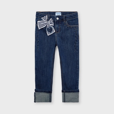 Mayoral dívčí rifle s aplikacemi kamínků a mašle. Rifle mají v pase regulační gumičky, na přední i zadní straně jsou 2 funkční kapsy, zapínání je na cvok a zip. Riflovina je odlehčená, tmavě modrá.