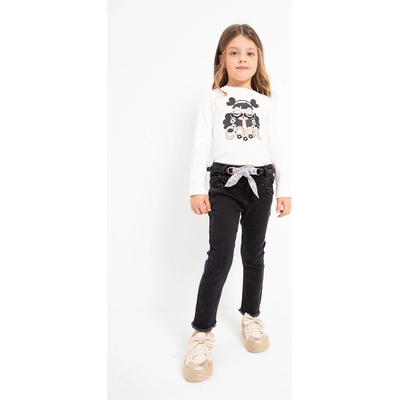 Mayoral dívčí rifle s aplikacemi kamínků a mašle. Rifle mají v pase regulační gumičky, na přední i zadní straně jsou 2 funkční kapsy, zapínání je na cvok a zip. Riflovina je...