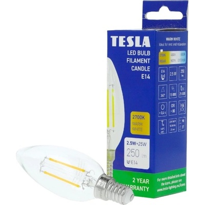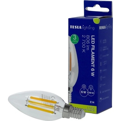 TESLA FILAMENT RETRO svíčka E14 6 W LED žárovka v retro designu pro patici E14, která ušetří energie oproti klasické žárovce. ZÁKLADNÍ SPECIFIKACE Patice: E14 Příkon: 6...