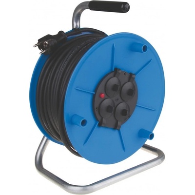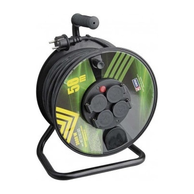 Venkovní prodlužovací kabel na bubnu 50 m, 4 zásuvky, černý, guma-neopren, 230 V, 1,5 mm2. Jeho výhodami jsou odolné kovové tělo, vodicí oko pro plynulé navinutí kabelu a brzda...