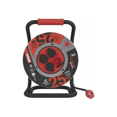 Prodlužovací kabel na bubnu 25 m, 1 zásuvka, červený, PVC, 230 V, 1,5 mm2. Jeho výhodami jsou vodicí oko pro plynulé navinutí kabelu a brzda cívky, která brání samovolnému...