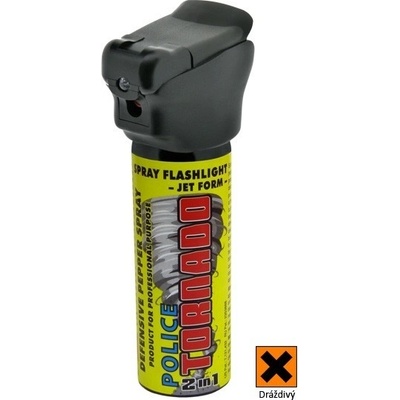 Sprejovou svítilnu "TORNADO" v provedení 100 ml. Na klasické nádobce pepřového spreje (Oleoresin Capsicum-OC 15%) je hlavice osazená supersvítivou LED diodou. Krycí víčko, zabraňující nechtěnému výstřiku, obsahuje 2 ks baterií CR2032 a funguje zároveň jako spínač...