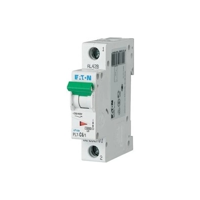 Jednofázový hlavní jistič EATON PL7-B6/1, jmenovitý proud 6A, charakteristika B, vypínací schopnost 10kA, pro střídavé i stejnosměrné napětí 230V/400V AC / 48V DC. EATON 262673