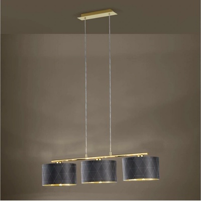 Závěsné svítidlo DOLORITA je vyrobeno ze tří kulatých černých textilních stínidel se zlatým vnitřkem, která jsou připevněna k podlouhlému kovovému prvku v mosazné barvě. Sofistikovaný geometrický vzor stínidel dodává lampě zvláštní vzhled. Kovový prvek byl zavěšen na...