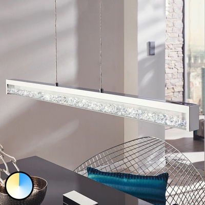 Závěsné LED svítidlo CARDITO 1 je vyrobeno z pochromovaného kovu a hliníku a je navíc kombinováno s podlouhlým skleněným tělem obsahujícím třpytivé skleněné kamínky. Jakmile se světlo rozsvítí, čiré skleněné prvky vytvoří jiskřivý a elegantní vzhled. Integrované LED...